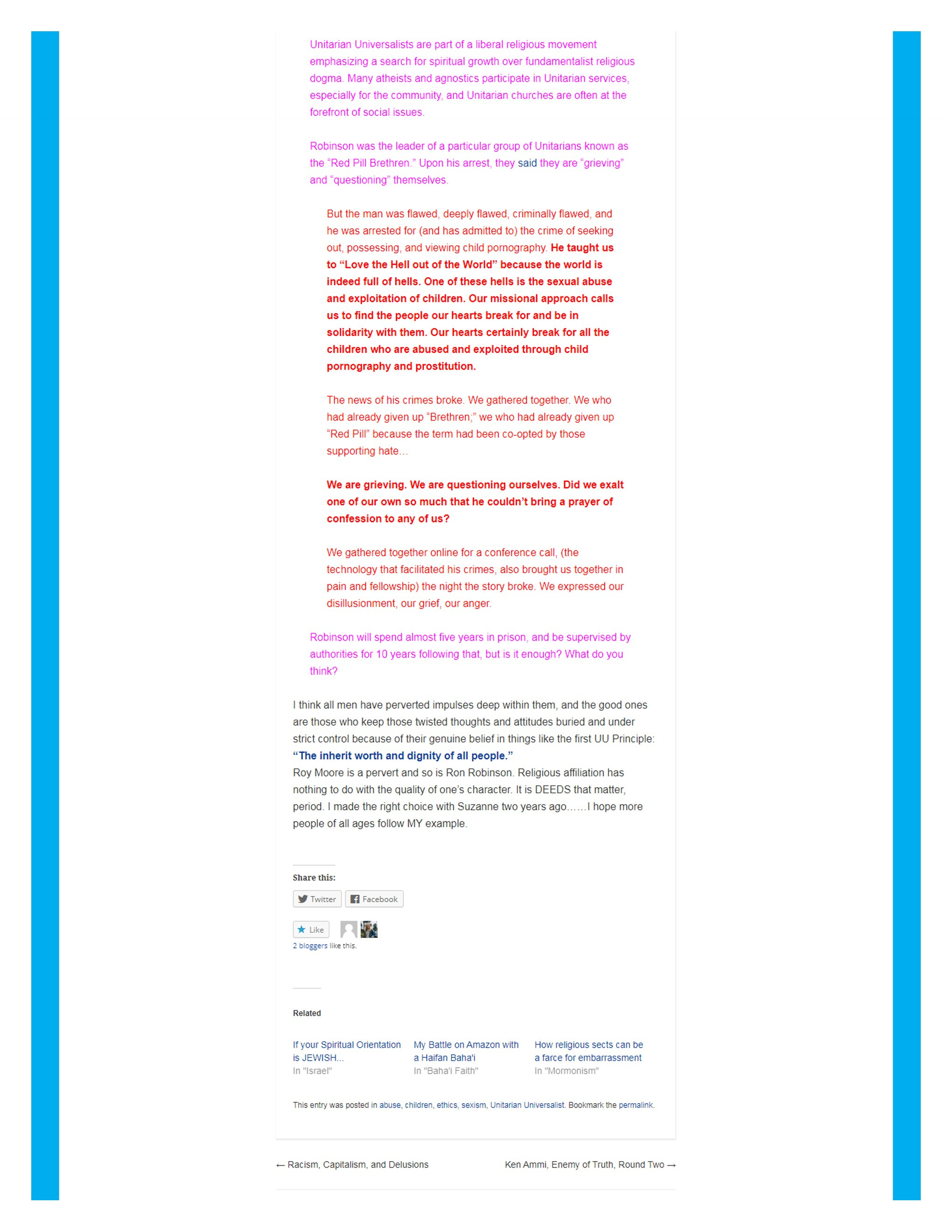 Had I been like Roy Moore, I imagine that I would have simply taken Suzanne to a motel room and manipulated or even forced her into bed with me, taking her virginity and feeling like I’d made another sexual conquest. But that would have ruined both of us and if she later told others what I’d done, it would have led to me being so disgraced that no one, not even my fellow UUs, would ever trust or respect me again! Indeed, there is a clear case of a UU minister who was exposed recently as a pedophile!